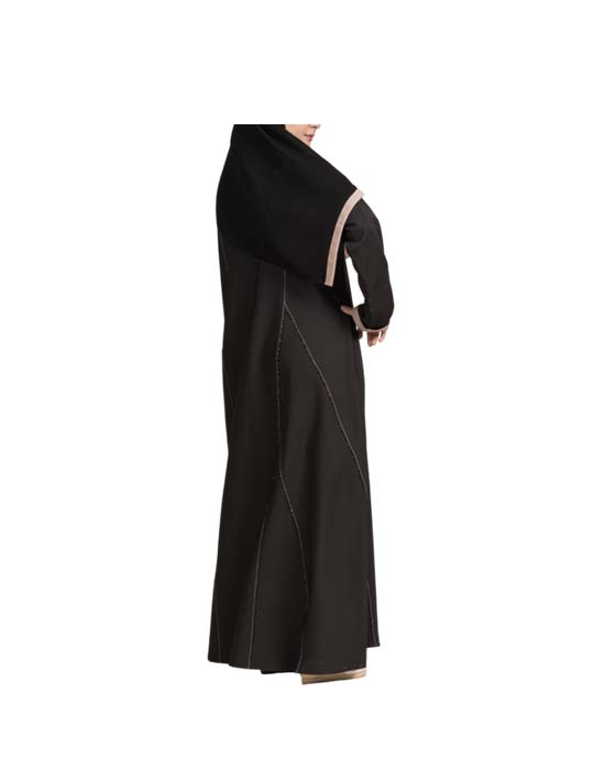 Enjoy a distinctive look with this half-cloche style abaya made of black crepe. It comes with a top snap closure and narrow foldable sleeves, decorated with black motifs outlined in beige on the front and back with a linen insert, making it your perfect choice for elegant looks.