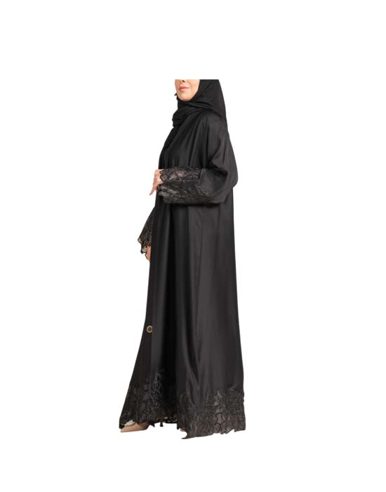 Shine with a charming look with this semi-cloche abaya made of shiny black silk fabric.