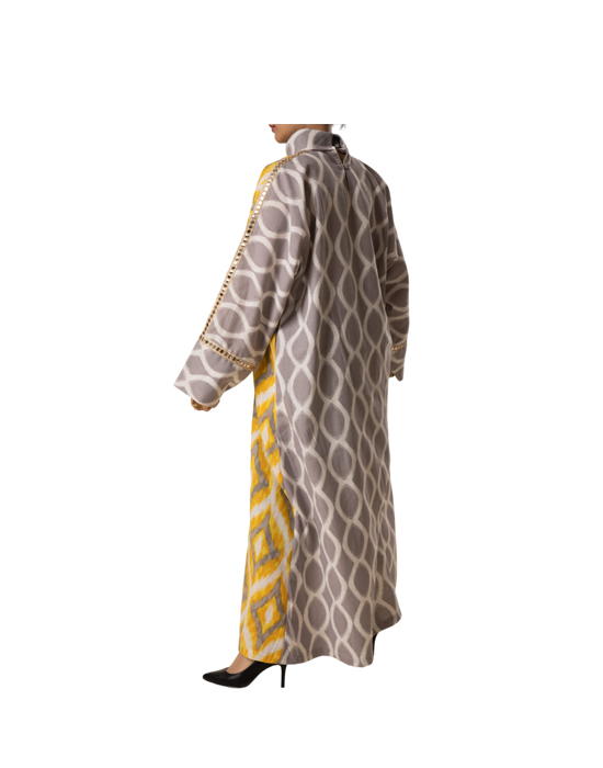 Jalabiya with a design that combines originality and elegance by combining plain and wooded linen fabric, defined by a longitudinal brocade collar and on the sleeves, a design that is suitable for luxurious occasions.