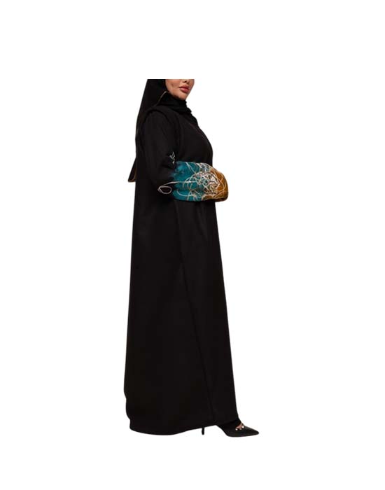 A wonderful winter abaya designed from black felt fabric with a flared cut. The abaya features wintery color overlays on the sleeves, enhancing its appeal and adding a touch of elegance. The abaya also has hidden pockets, making it more practical and an ideal choice for warm and modern winter looks.