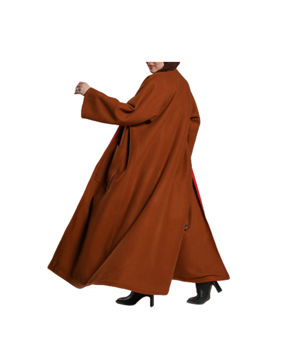 Double-sided winter fur designed like an abaya, its style is in line with the latest fashion trends, designed from camel-colored felt fabric with front pockets added to make it more practical, and from the inside it is designed from jacket fabric in a vibrant fuchsia color, to keep your look more daring this winter