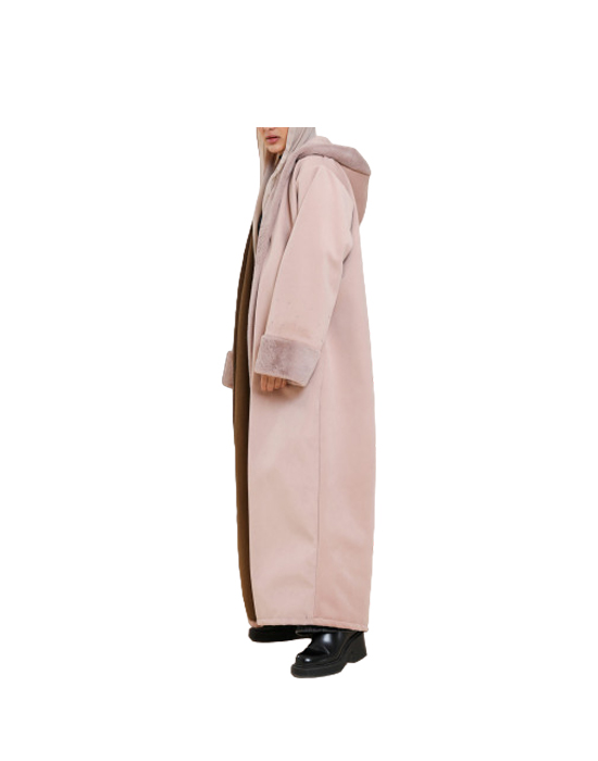 Soft fur designed like an abaya, its style is in line with the latest fashion trends, designed from light pink felt fabric, with the addition of matte crystal beads on the sleeves and hidden pockets, to make your look more daring and elegant this winter