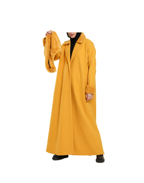 A luxurious yellow winter fur designed like an abaya, its style is in line with the latest fashion trends.